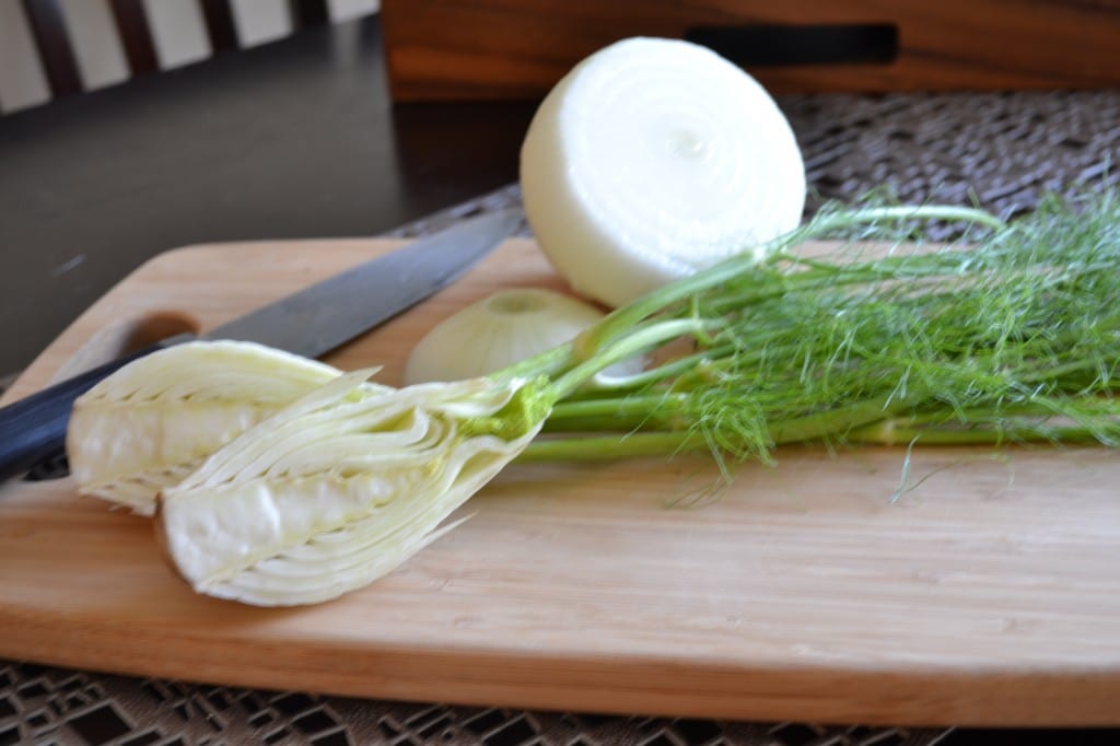 If you haven’t worked with fennel before make sure you cut off the fronds and use the bulb only for the sauce. Cut it into fourths and cut out the core on an angle.