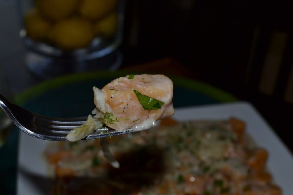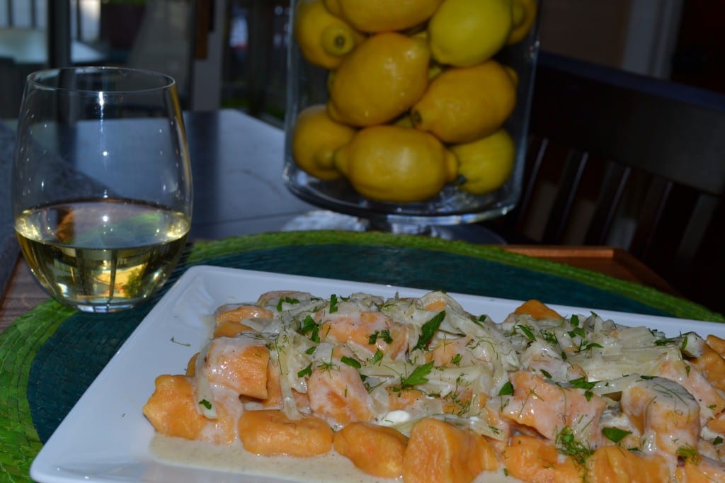Mix all the ingredients in a bowl until a ball of dough starts to form. Take a handful of dough and roll it into a snake-like shape on a floured surface. Cut into 1/2 inch pieces. Drop the gnocchi into salted boiling water. When the gnocchi float they are cooked. Top gnocchi with sauce and garnish with chopped fennel fronds and a little bit of parsley.
