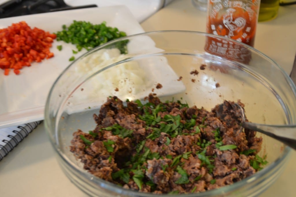 Add cayenne, cumin, salt, pepper, chili powder, Sriracha to the black beans. Mash beans until 3/4 of all the beans are mashed. Add in the jalapeños, red pepper, onion, and parsley. Using a large spoon, mash the ingredients until the parsley, peppers, and onion are evenly distributed.