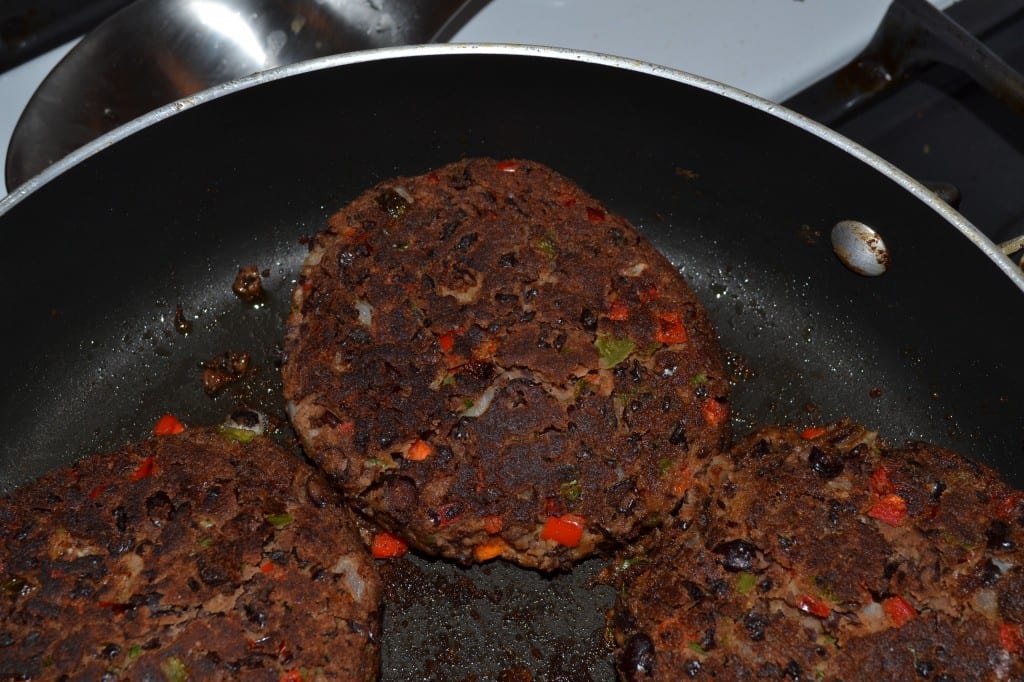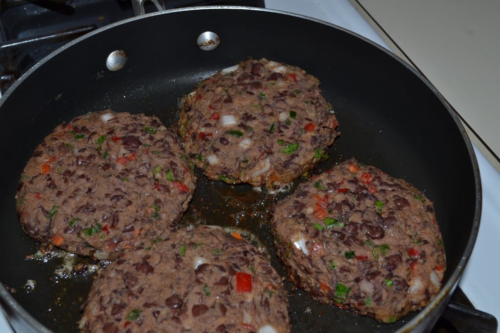 Add the egg and panko crumbs. Using a large spoon, combine all ingredients until they start to stick together. This mixture should make 8 small flat burgers. Add the olive oil to the pan. Heat over medium. Add in your burgers, 4 at a time.