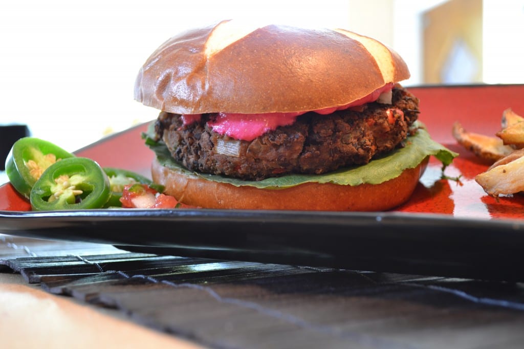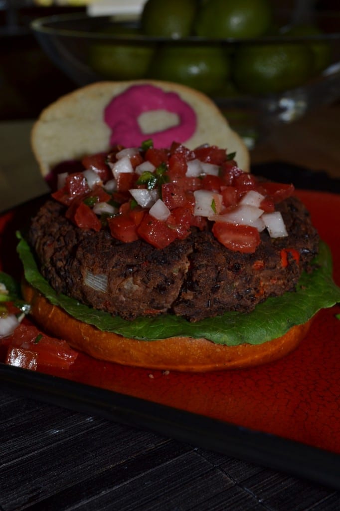 Combine all ingredients in a food processor and puree! The sauce is a nice sweet and tangy accompaniment to the spicy black bean burgers and also tastes amazing on chicken breast and turkey burgers.