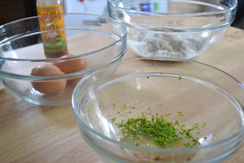 Mix the eggs with the hot sauce. In a large bowl, combine the salt and pepper with the flour.