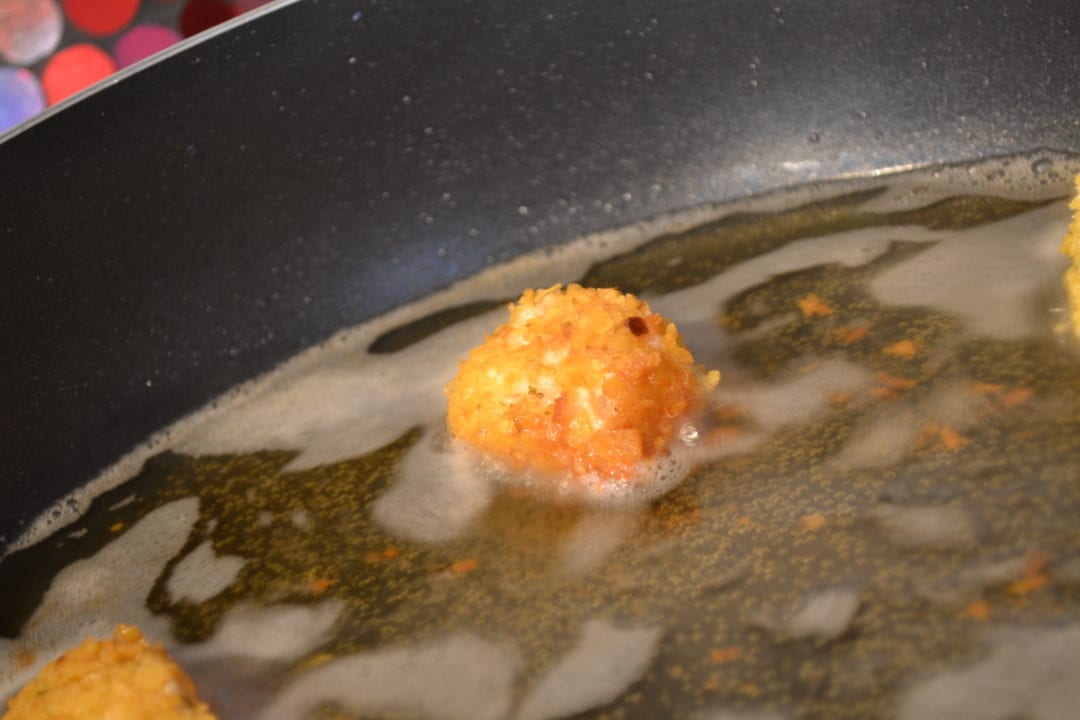 Add the oil (about an inch deep) to a large pan. Heat oil to about 280 degrees. This is going to be a lower slower fry.