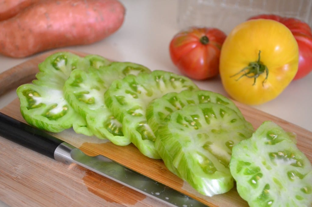 Cut the green tomato into thin large slices. Individually dredge the tomato slices in the flour, salt, pepper, and crushed red pepper mixture.