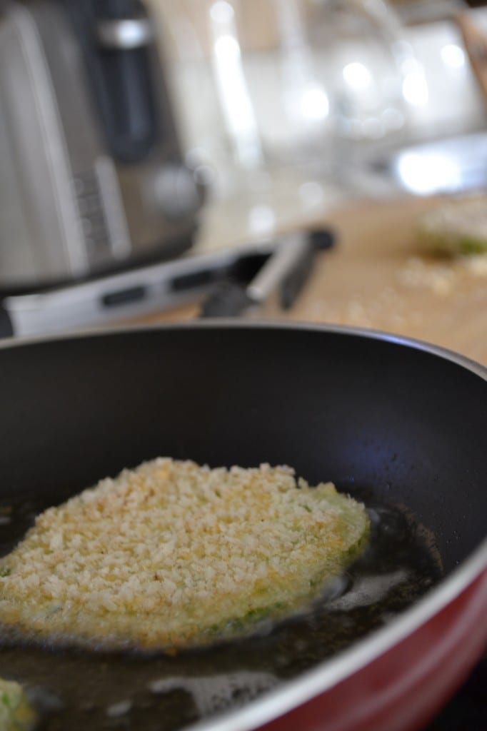 Then dip the flour covered tomato slice in egg. Coat evenly, with egg mixture, on both sides. Then coat the egg and flour covered tomato slice in the panko crumbs.