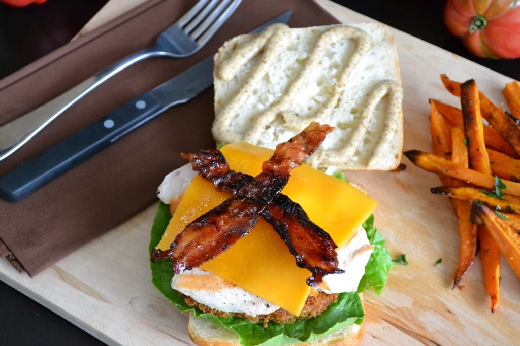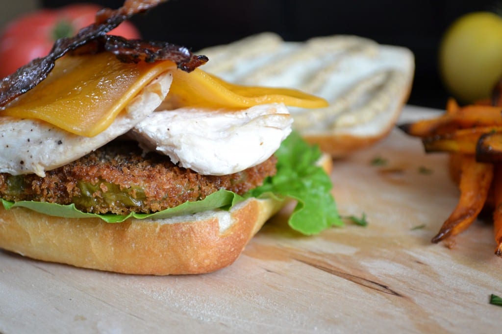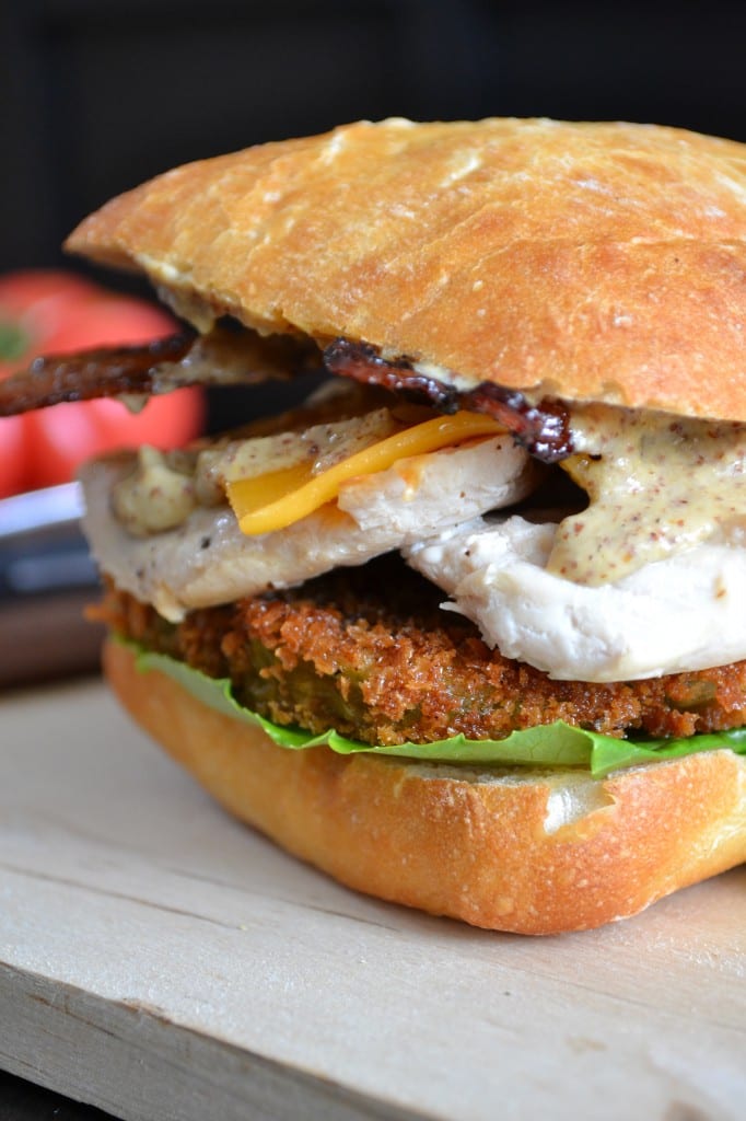 Chicken Breast, Fried Green Tomato, Maple Cinnamon Bacon, Lettuce, Cheddar Cheese, & Spicy Mustard on a Ciabatta Roll