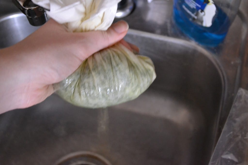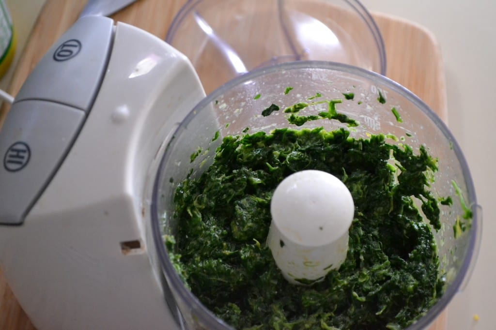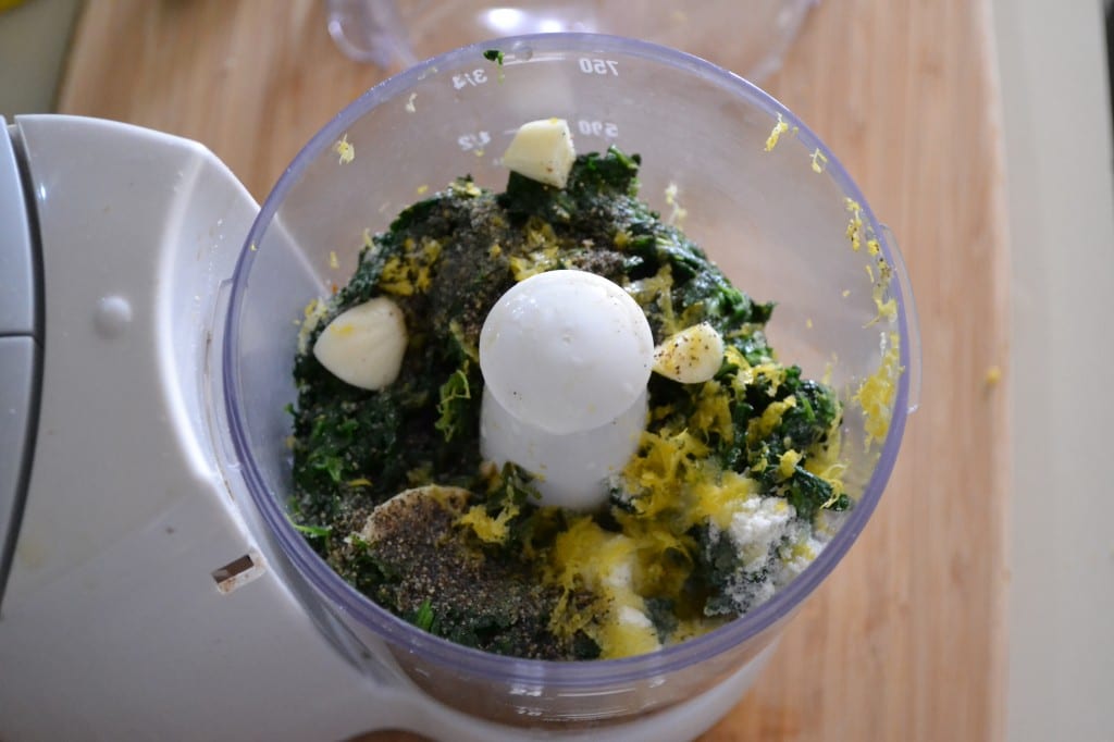 Place the defrosted spinach on a paper towel and squeeze the paper towel around the spinach until all the liquid is drained. Add the dry spinach, lemon juice, lemon zest, salt, pepper, garlic, parmesan cheese, and olive oil to a food processor. Pulse until a thick sauce is formed.