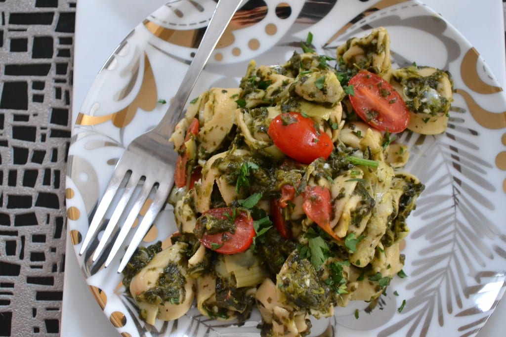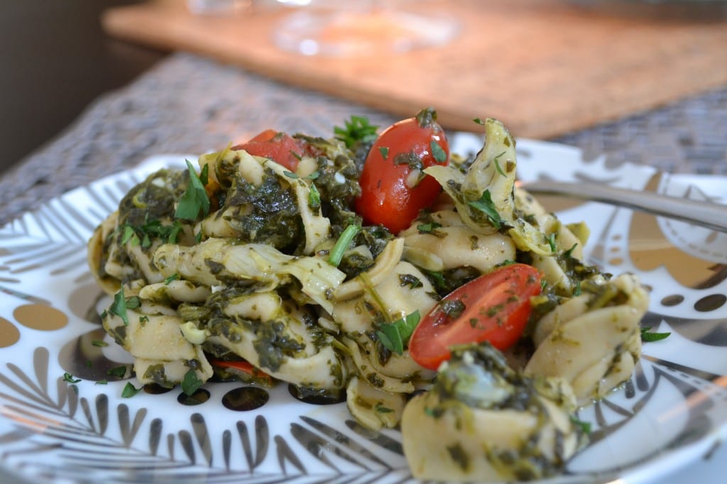 Scoop the pesto into the large sauce pan that has the cooked tomatoes and artichokes. Add the salty pasta water. Simmer for a few minutes to bring all the flavors together.