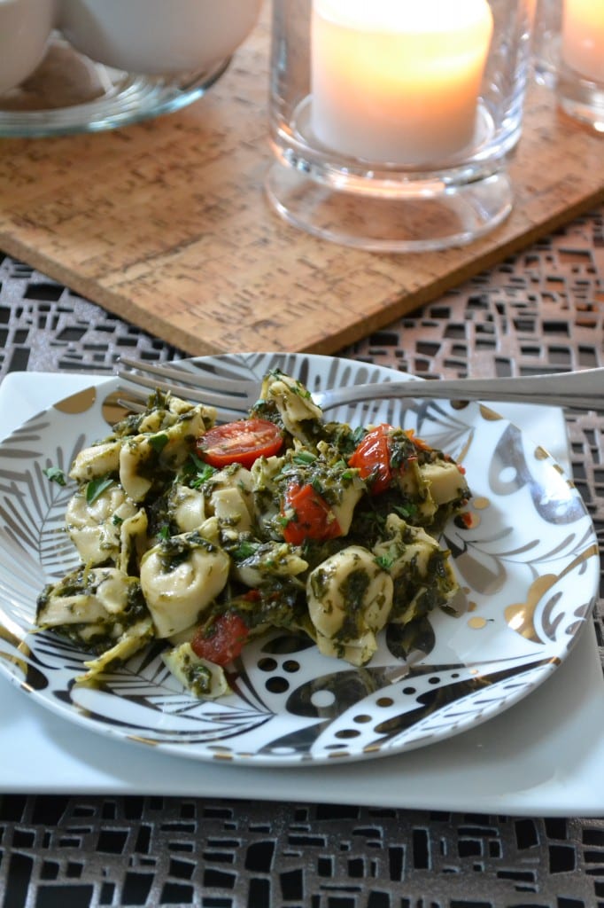 Bring 4 quarts of salted water to a boil Add in the tortellini and cook for 7 minutes. Drain the noodles. Add them to the large pan with the pesto, tomatoes, and artichokes. Stir the sauce around until all noodles are evenly coated.