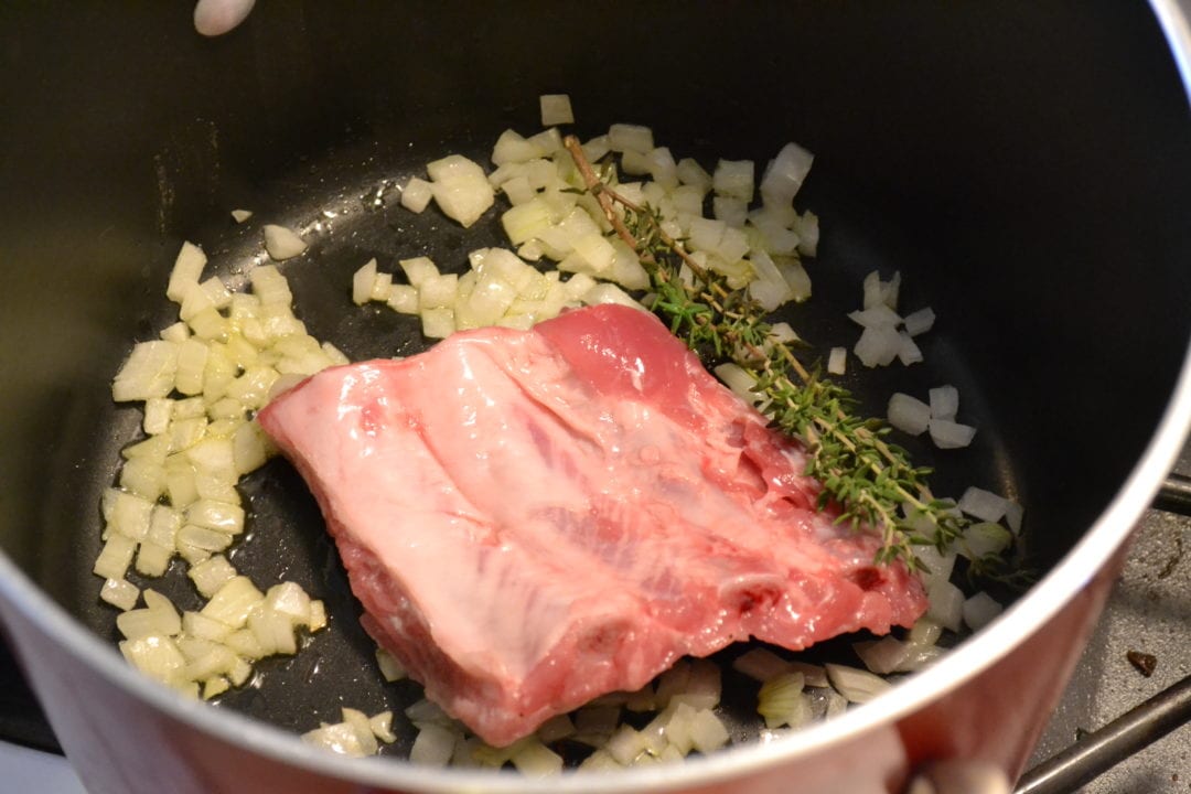 Add the diced onion and olive oil to a large stock pot and cook over medium heat until the onions become translucent. Add the grated garlic and stir to evenly distribute. Raise the heat to medium/high and add in the pork ribs. Cook them for five minutes. Add the cup of water and thyme sprigs. Flip the ribs and give the pot a stir to loosen any bits of pork off the bottom of the pot.