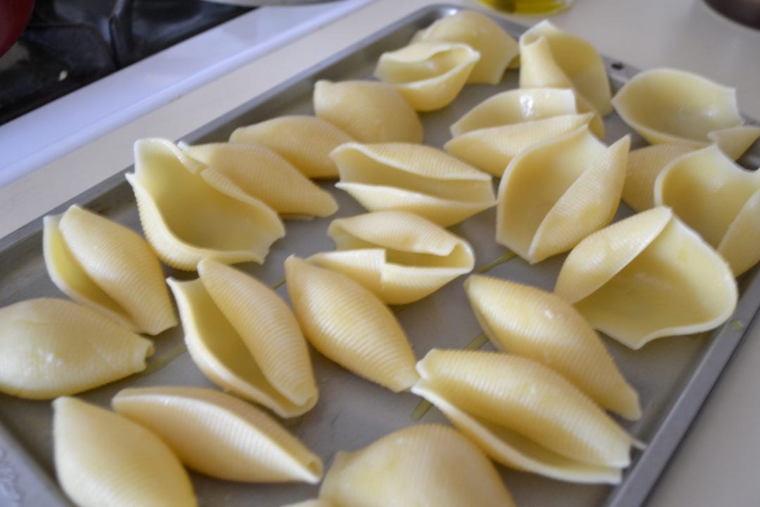 Add the shells to a large pot of boiling water. Boil the shells for approximately 8 minutes. They will not be cooked all the way through. Drain shells and immediately place them on a sheet pan to dry and cool.