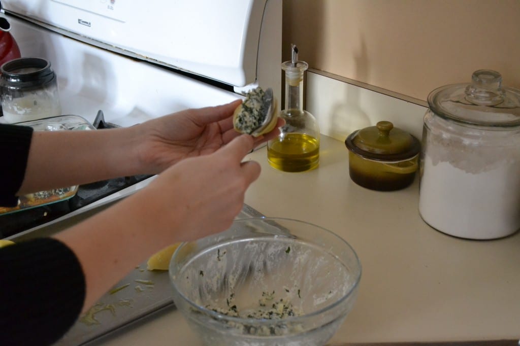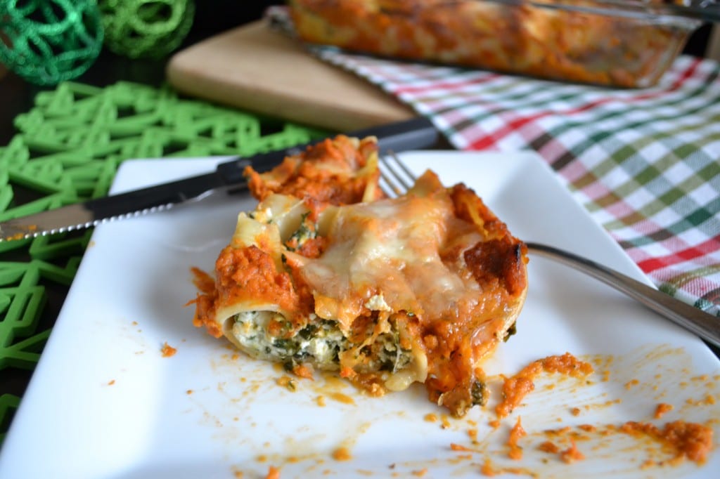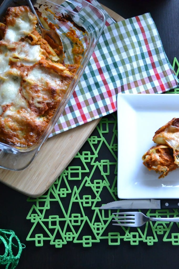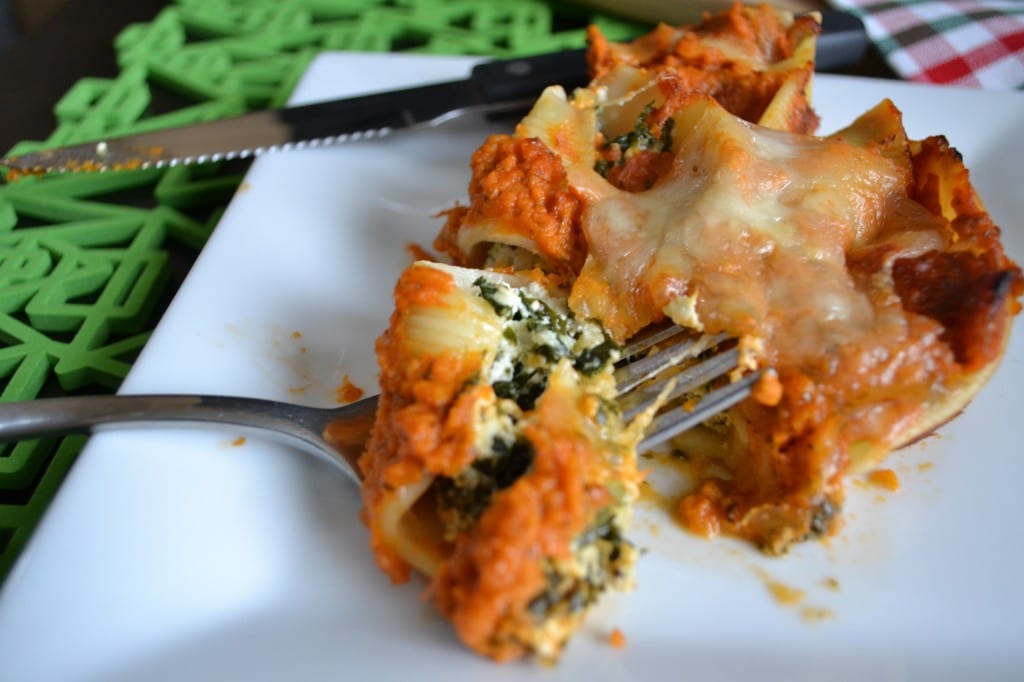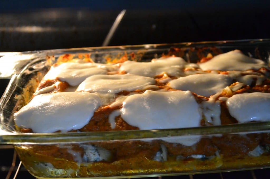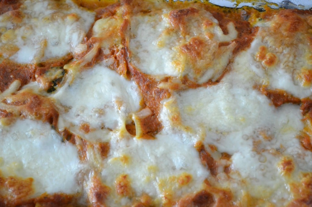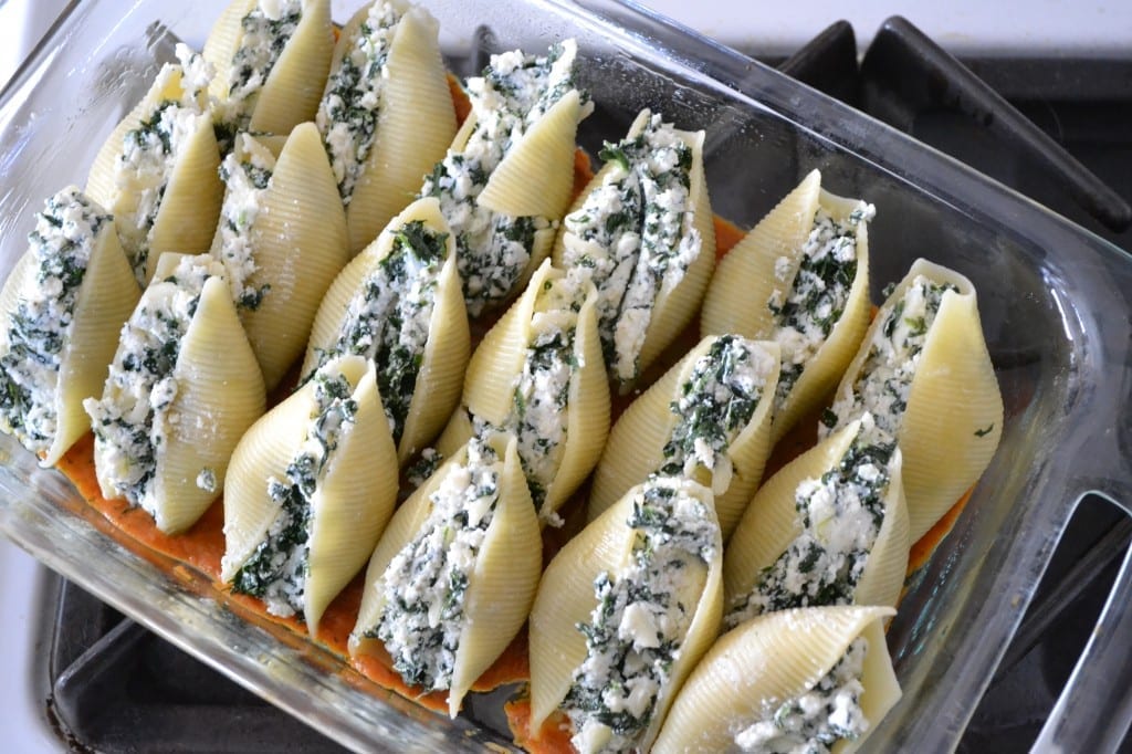 Coat the inside of a 7”x11” Pyrex dish with a tablespoon of olive oil. Coat the bottom of the dish with a thin layer of sauce to prevent sticking. Take a heaping spoonful of the cheese and spinach mixture and gently place it into each shell. Then arrange the shells into three rows in the dish.
