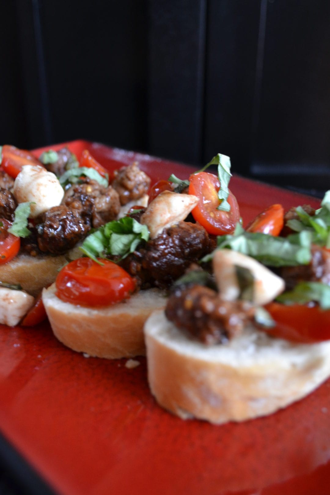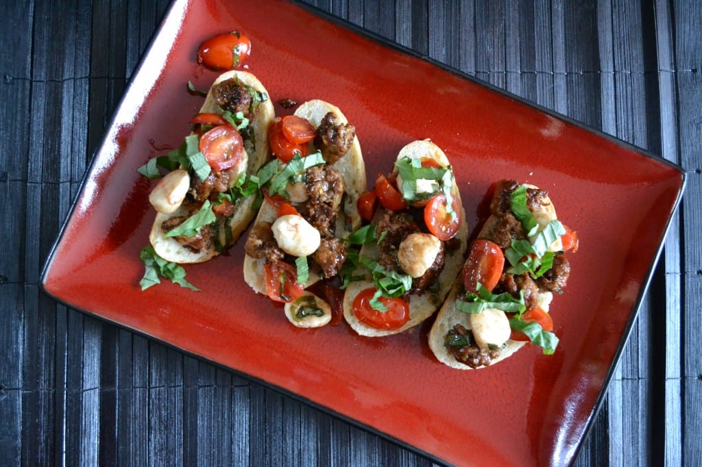 The addition of a mild pork Italian sausage to the normal bruschetta takes this traditional vegetarian dish and makes it into more of an entrée or a heavier appetizer to lead into the main course. I highly recommend bringing this dish to your Christmas dinner. After all, it is red and green!