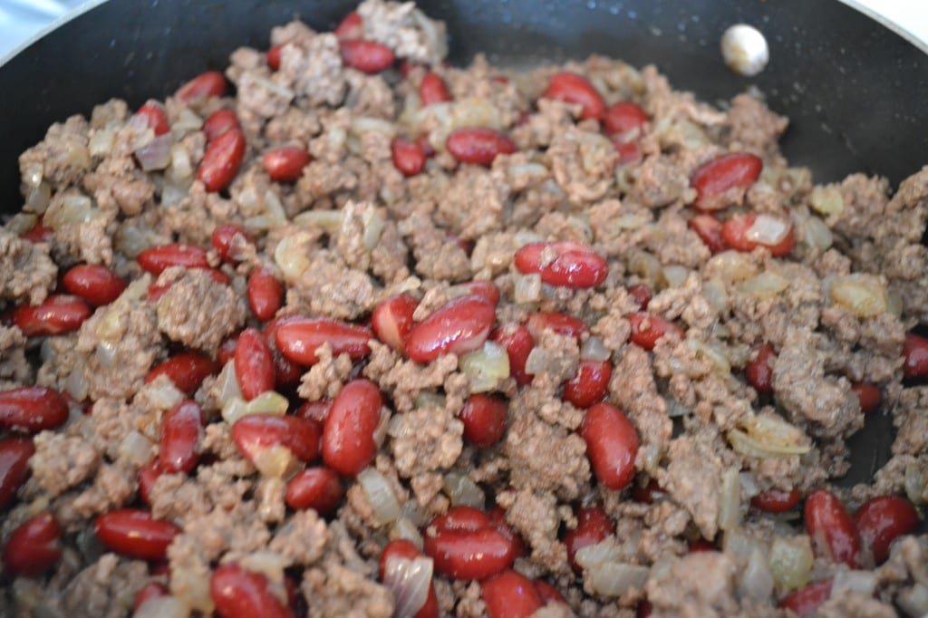 - Cook the ground beef in a large skillet over medium/high heat for about 7 minutes. Add in the chopped onion and spices. Cook the mix until the beef has browned. Remove from heat. Drain the beef and onion mixture. Add in the kidney beans and let the beef and onion cool completely.