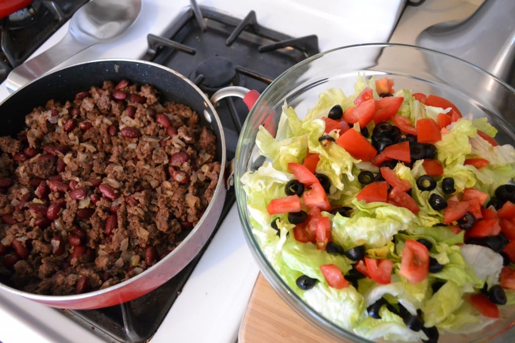If you want to skip the cold ground beef in the salad, I highly recommend adding in shredded rotisserie chicken to the onion and bean step. It works just as well.