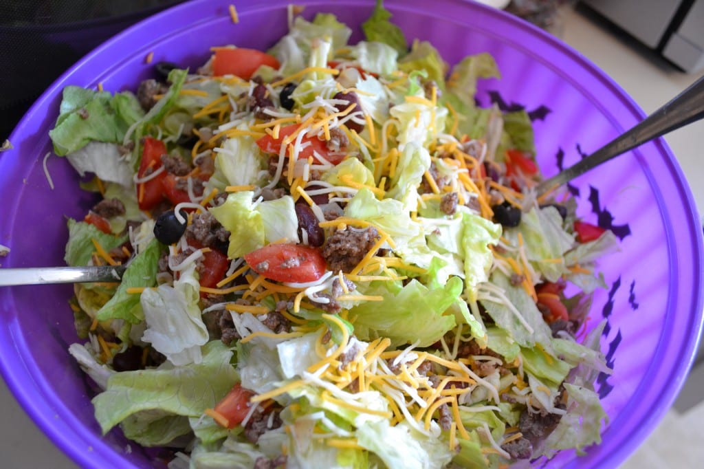 In a large (when I say large, I mean very large) bowl, combine the lettuce, olives, tomatoes, and cheese. Add in the cooled beef, onions, and kidney beans. Mix salad ingredients together.