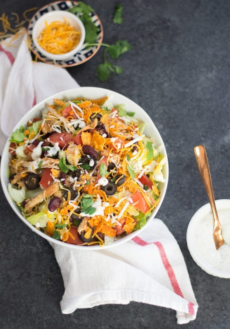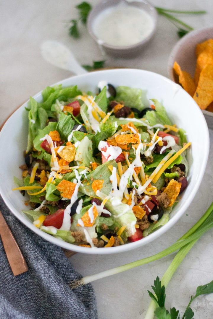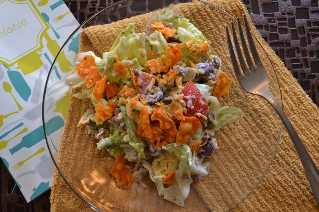 Taco salad with Doritos has to be one of my favorite foods of all time. Crisp lettuce tossed with cheese, black olives, tomatoes, and a mix of beer, onion, and kidney beans all coated in a creamy ranch dressing. Whoever invented this original recipe concept deserves a Nobel Prize.