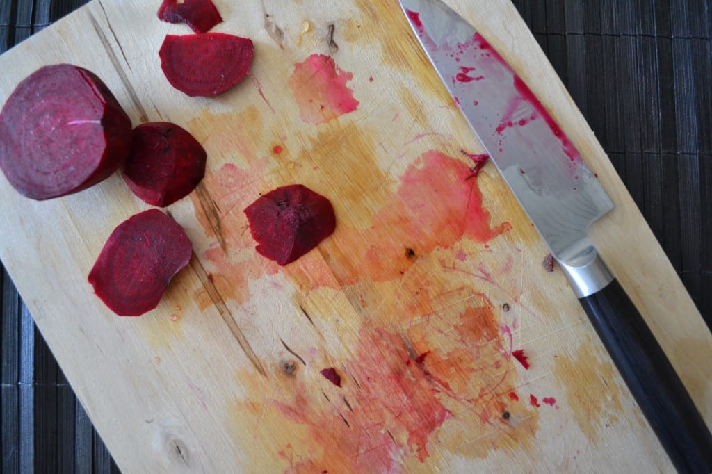 While the salmon is marinating, preheat the oven to 375 degrees. Using a vegetable peeler, remove the skin from the beets. WARNING: Beets stain your hands, counters, wooden cutting boards, and clothes. So be careful and wash your hands immediately after dealing with them.