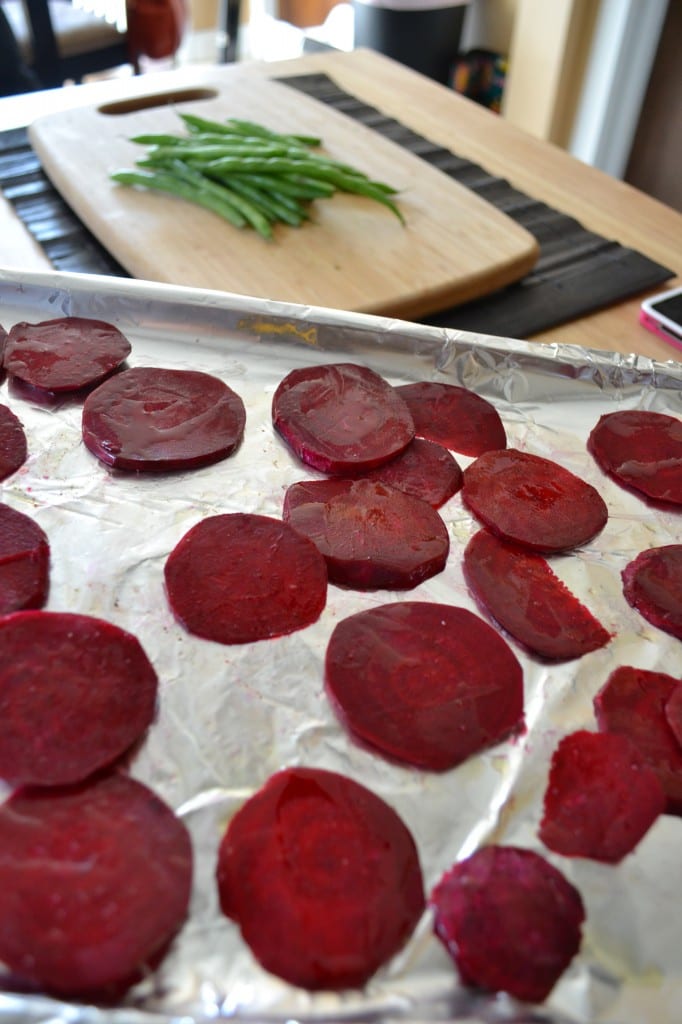 Thinly slice the beets. Place them on a tin-foil lined baking sheet. Drizzle the beets with a little bit of olive oil, a dash of pepper and salt. Roast the beets in the oven for 20 minutes. At ten minutes remove the beet slices and flip them.