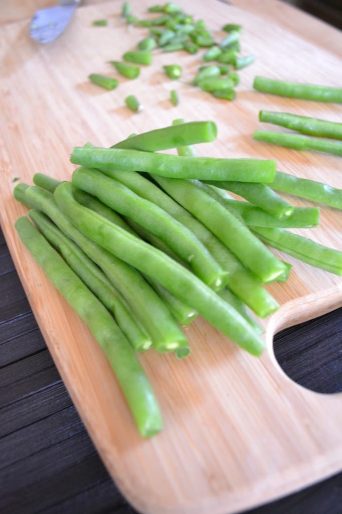 While the beets are roasting, bring 2 cups of water to a boil in a small pot. When the water is at a rolling boil, add in the trimmed green beans. Blanch the green beans for about three minutes. When they are done, place them into a bowl filled with cold water and a few ice cubes to stop them from any additional cooking.