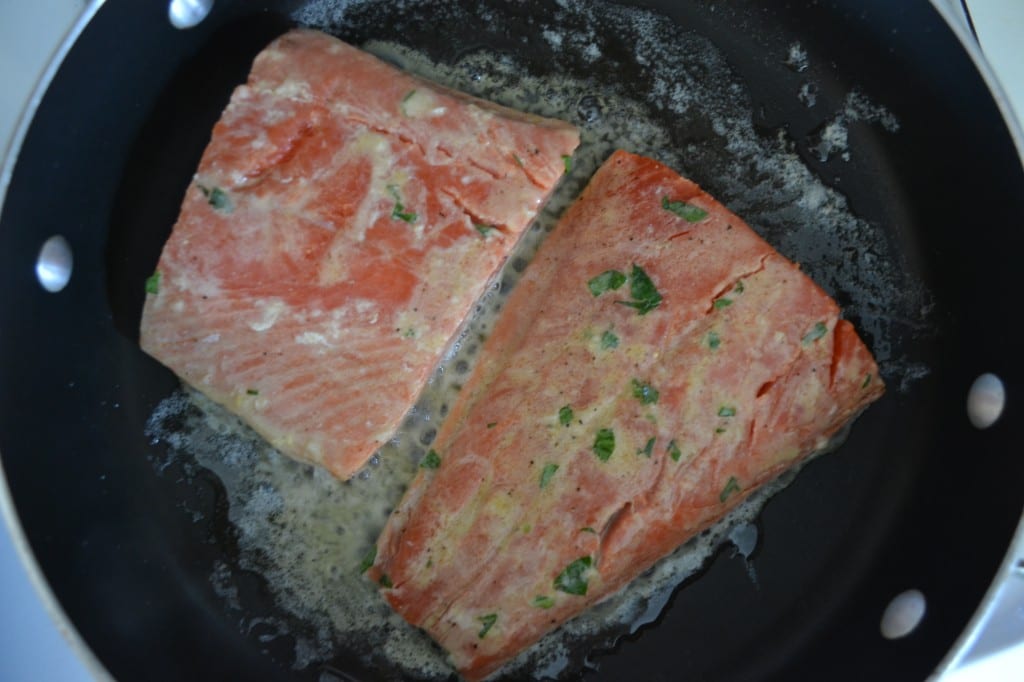 In a large skillet, melt a tablespoon of butter. Add the salmon filets, skin side down. NOTE: Fish does cook a lot easier with the skin on. The skin is also very easy to remove once the fish is cooked.