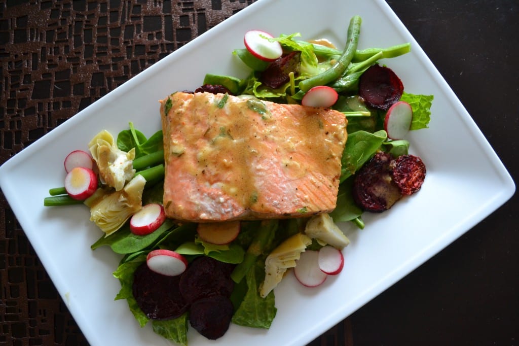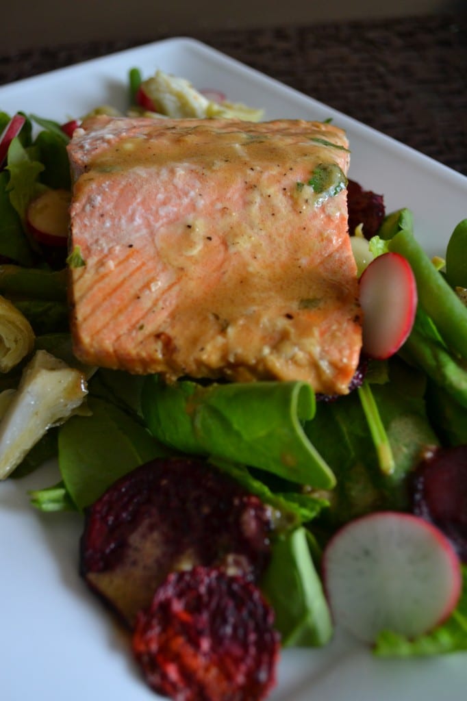 Remove the salmon from the pan and place it on the bed of lettuce, spinach and rest of the vegetables.
