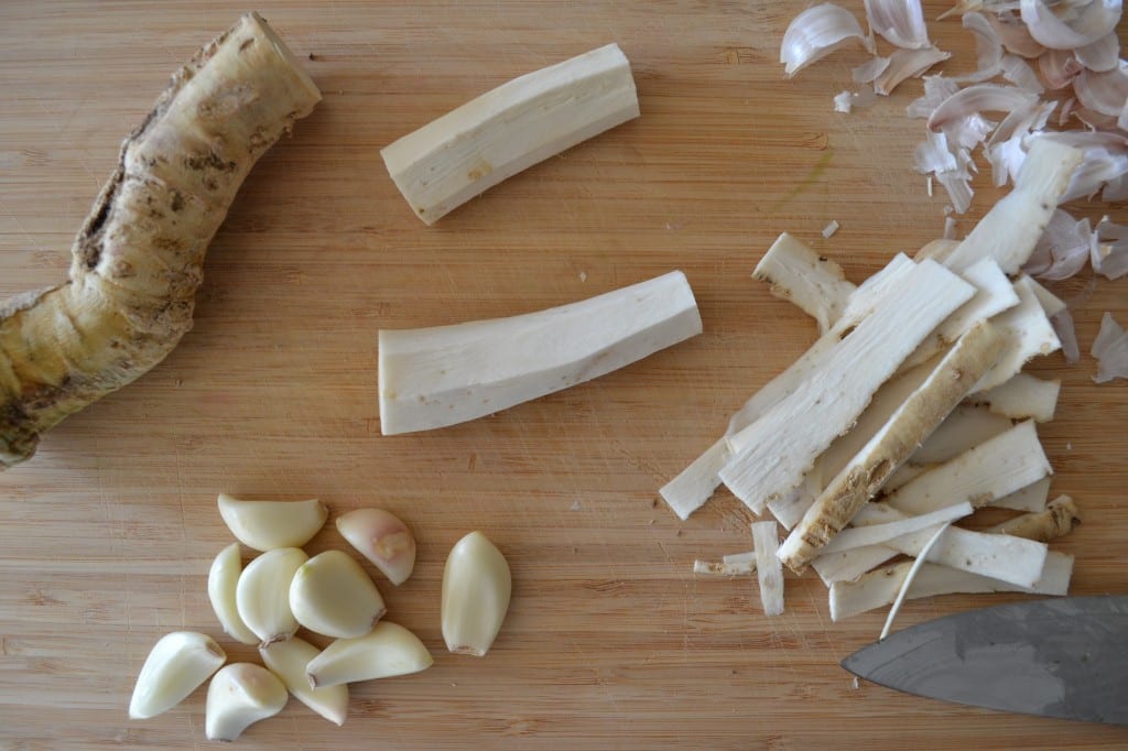I like the fresh horseradish root. I keep a giant root in my refrigerator most of the time. It can also be frozen. If I have one on hand, I find myself adding it to everything! In order to get a ½ cup of grated horseradish, you need to cut off a rather large piece. If you look at the root from the cut edge, you will see an outer ring. Peel or slice the skin and interior ring off. Then grate the root until you end up with ½ a cup of grated horseradish. You can also skin this all together and use the prepared stuff if you are crunched for time.