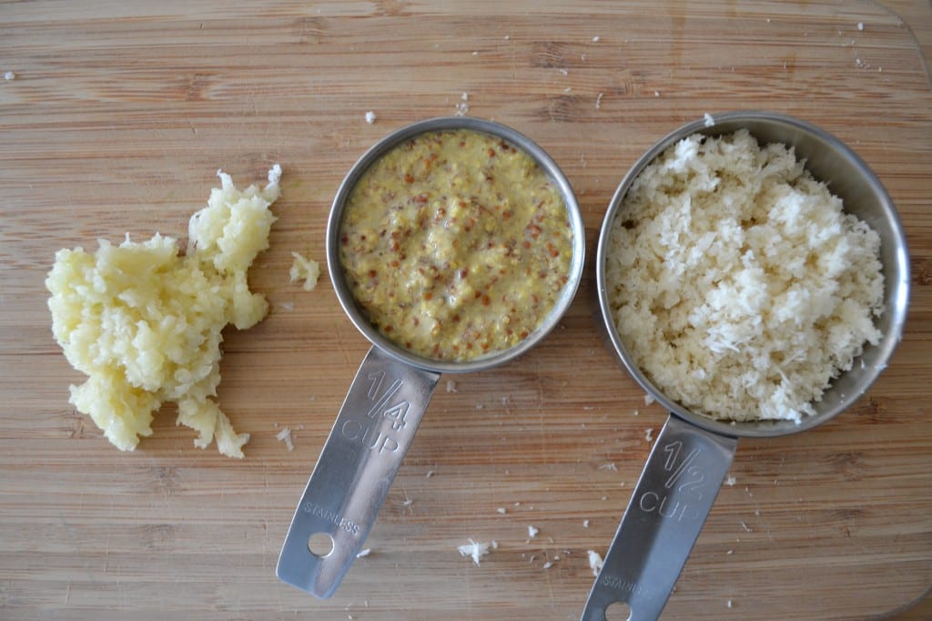 Peel the cloves of garlic. Grate the cloves using a microplane. If you don’t feel like going through the trouble of grating cloves of garlic, use about two tablespoons of grated prepared garlic instead.