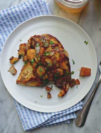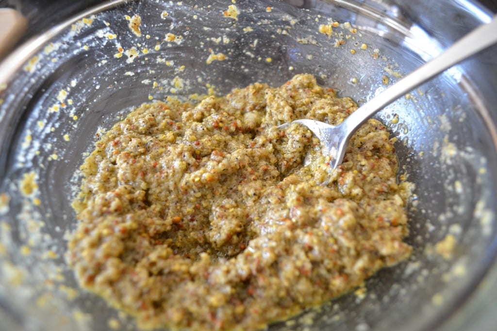 Place a tablespoon or two of the paste on the bottom of a Pyrex dish. Place the filets on top of the marinade paste. Spoon the remaining mixture on to the tops of the filets and spread it out into an even layer. Wrap the Pyrex dish in plastic wrap and refrigerate for 20 minutes at least and up to two hours before cooking.