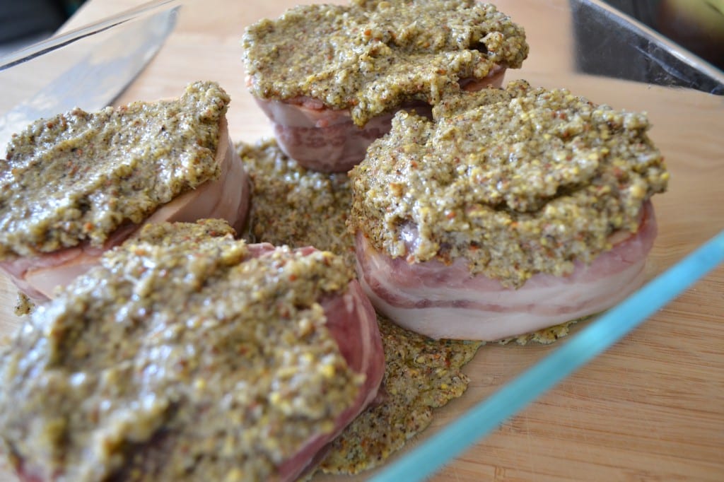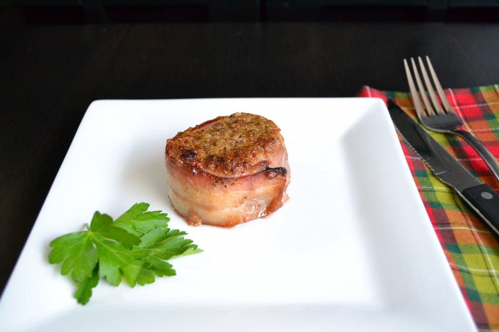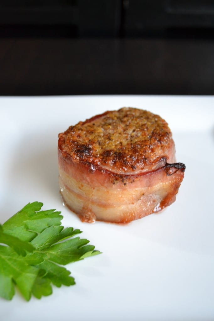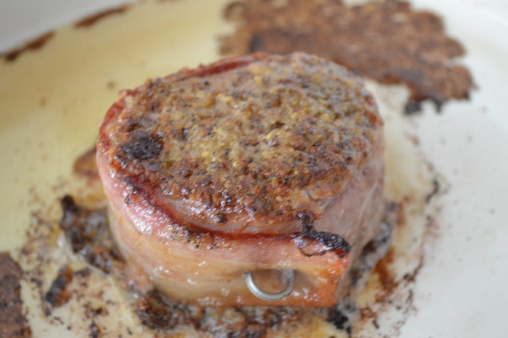 When the filets are done the crust will be perfect and dark golden. The bacon will be slightly chewy and crisp on the edges. Let the filets rest for five minutes before serving.