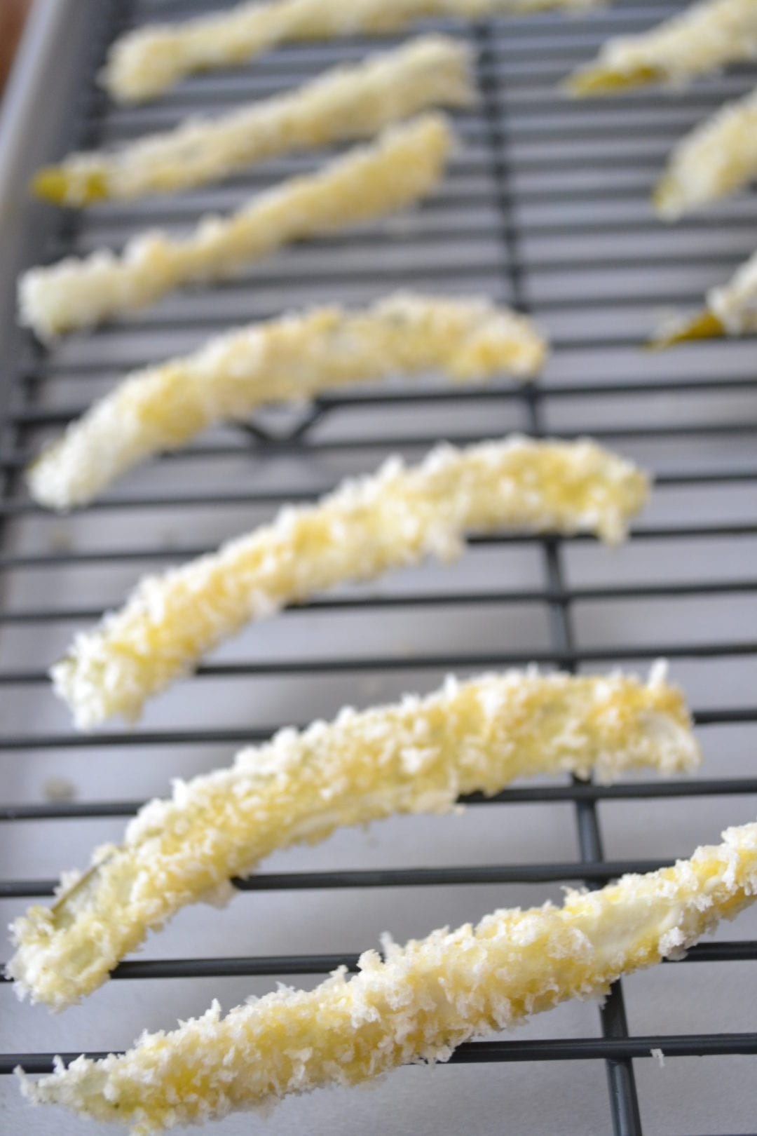The idea is to get a thin coating on the pickle. It doesn’t have to be coated entirely. Place the breaded spears on a wire rack to set up until the oil is heated.