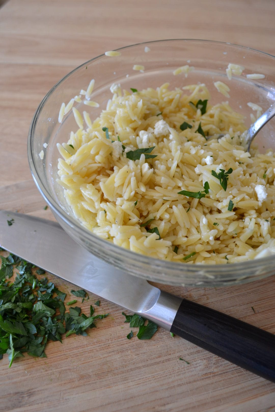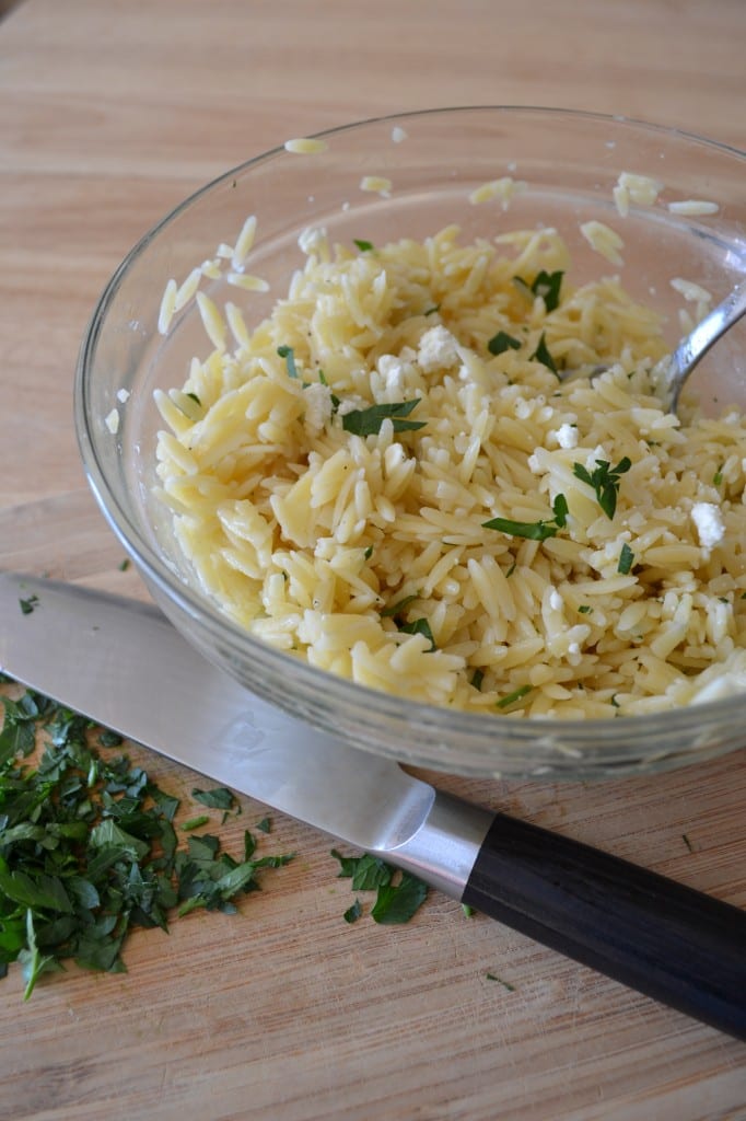 Meanwhile, bring the white wine to a boil. Boil the orzo in the wine for 7 minutes. Drain the orzo. Combine the orzo, parsley, feta, and a dash of salt and pepper in a small bowl.