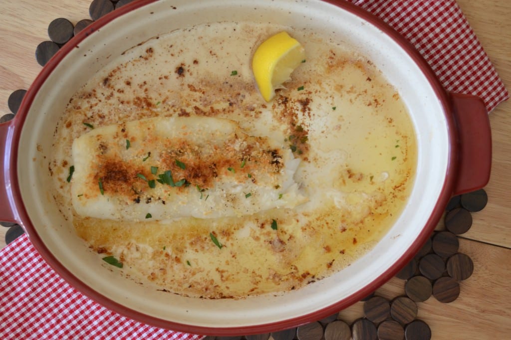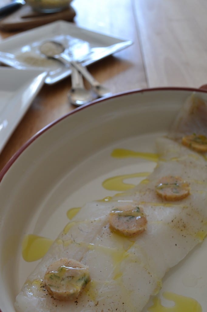 Prepare the brown butter in advance according to my recipe. Place a teaspoon of brown butter in the bottom of an oven-safe dish and then place the cod on top of it. Place the other three teaspoons of brown butter on top of the cod. Season the fish with salt and pepper.