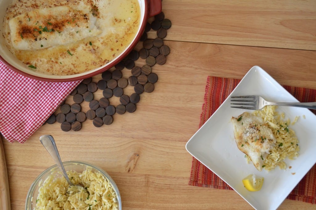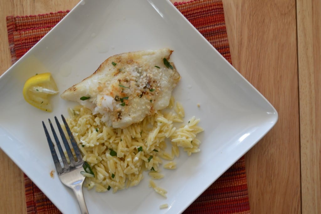 Cut off a piece of fish for yourself and serve it with the white wine orzo and a squeeze of lemon juice to add a note of brightness.
