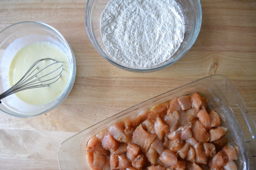 Working with one piece at a time, dip the chicken in the buttermilk/egg mixture then, let some of the excess drip off before placing it in the flour/corn starch mixture. Coat the chicken in flour, then place it on a pan to slightly dry off before you fry it.