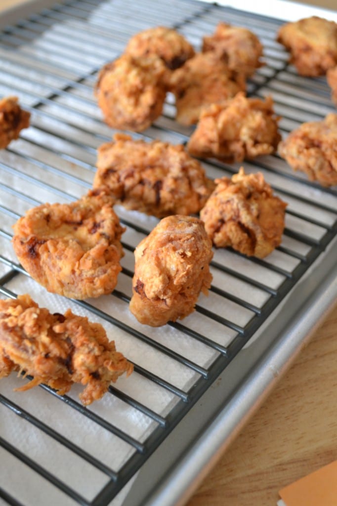 When about 1/3 of the chicken is fried, toss them with about ½ cup of buffalo sauce. It is best to do this when they are hot, and then place them on a wire rack to drain and cool.