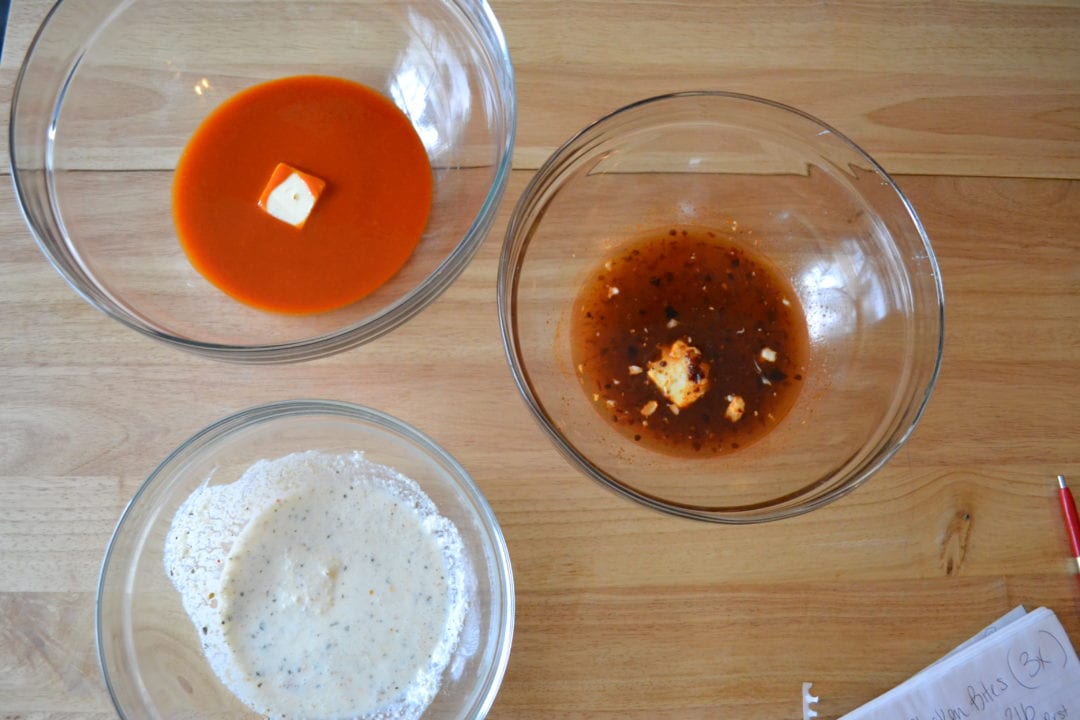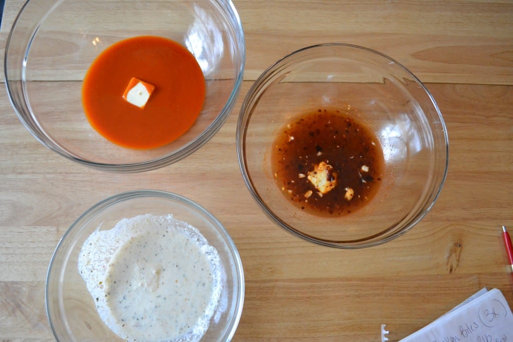 Before you say, “There are only two sauces above Stefanie! What the heck!” The third sauce is just whatever buffalo sauce you like plus a ½ tablespoon of unsalted butter. I used Frank’s Buffalo sauce. It is my favorite.