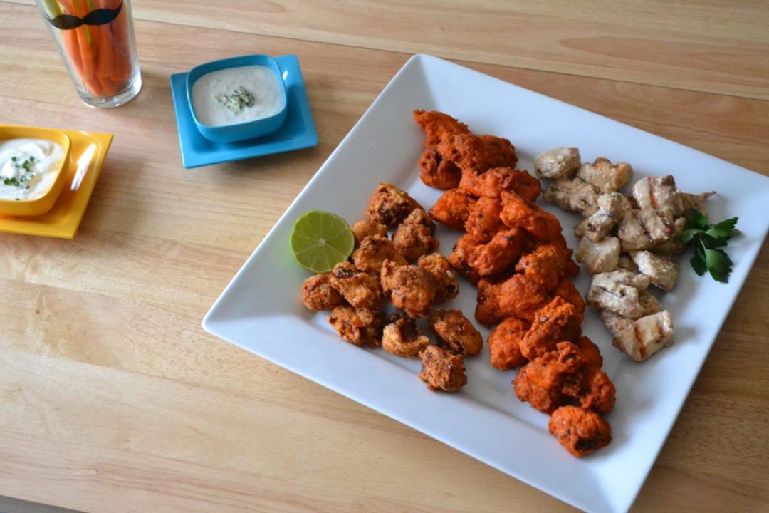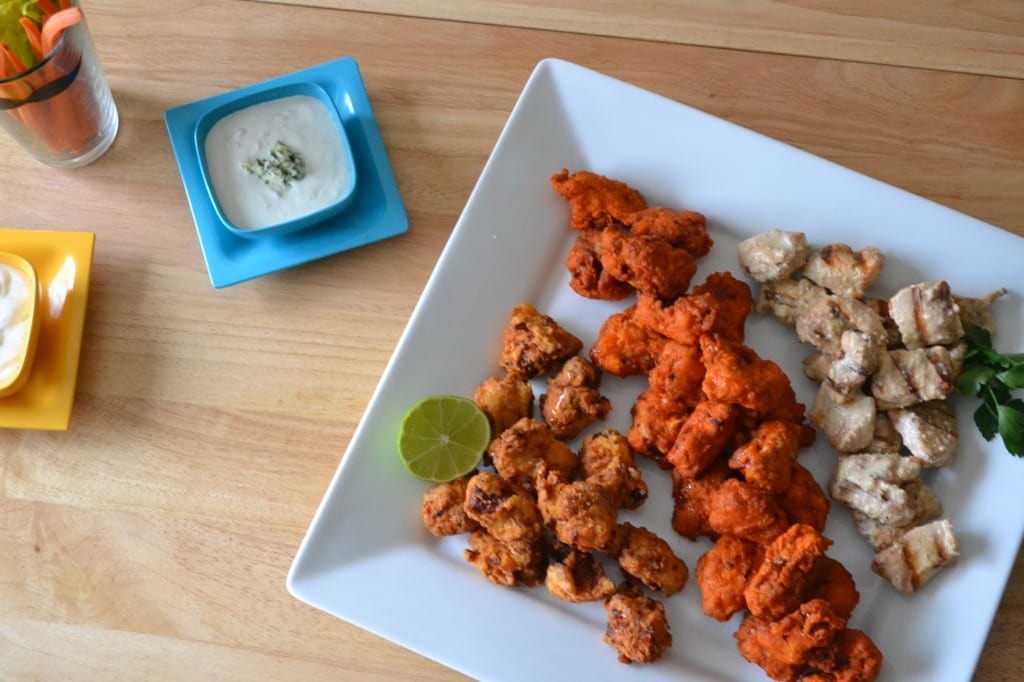 Serve up the bites with all the traditional fixins: celery, carrots, blue cheese dressing, and ranch dressing.