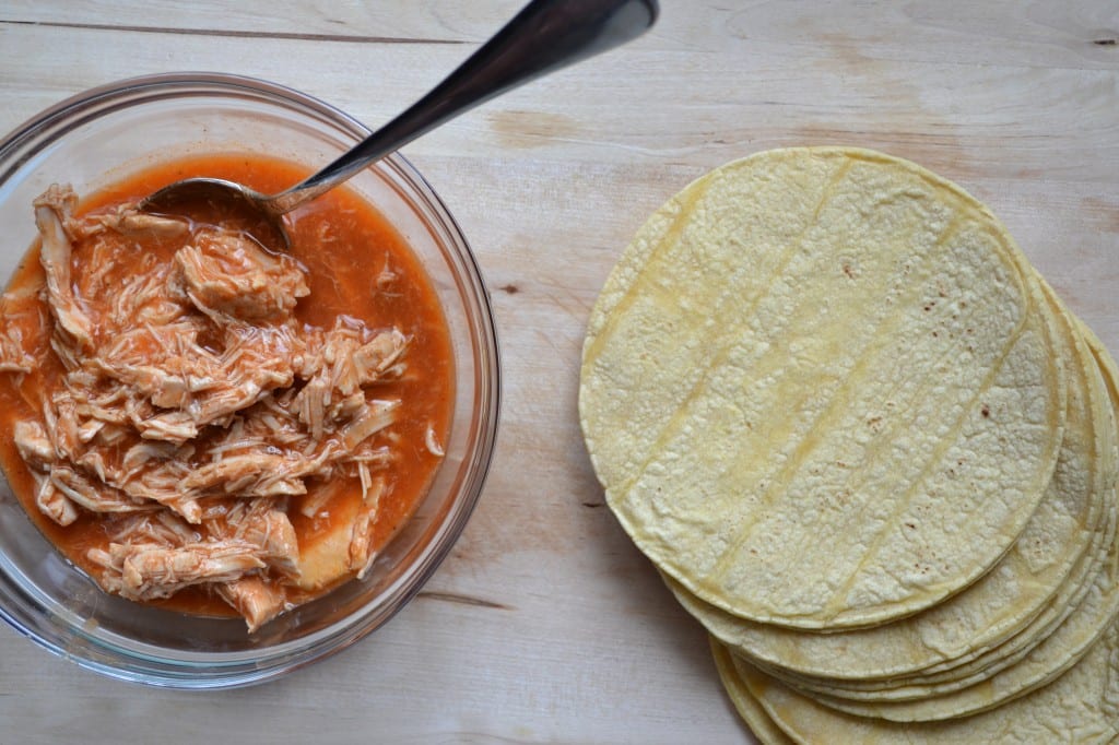 Dampen a paper towel, wrap the tortillas, and microwave them for a minute. This will make them easier to work with. Take the corn tortilla and place about 2 tablespoons worth of chicken in a line down the center of the tortilla.