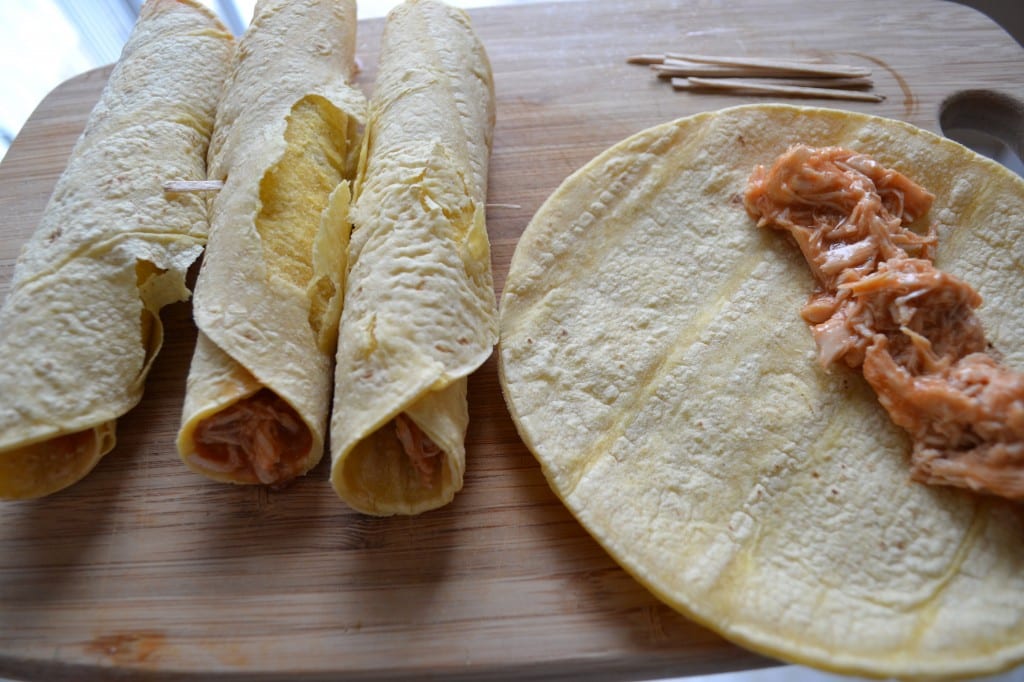 Roll the tortilla closed very tightly and secure with a toothpick. Keep going until you have made the desired amount.