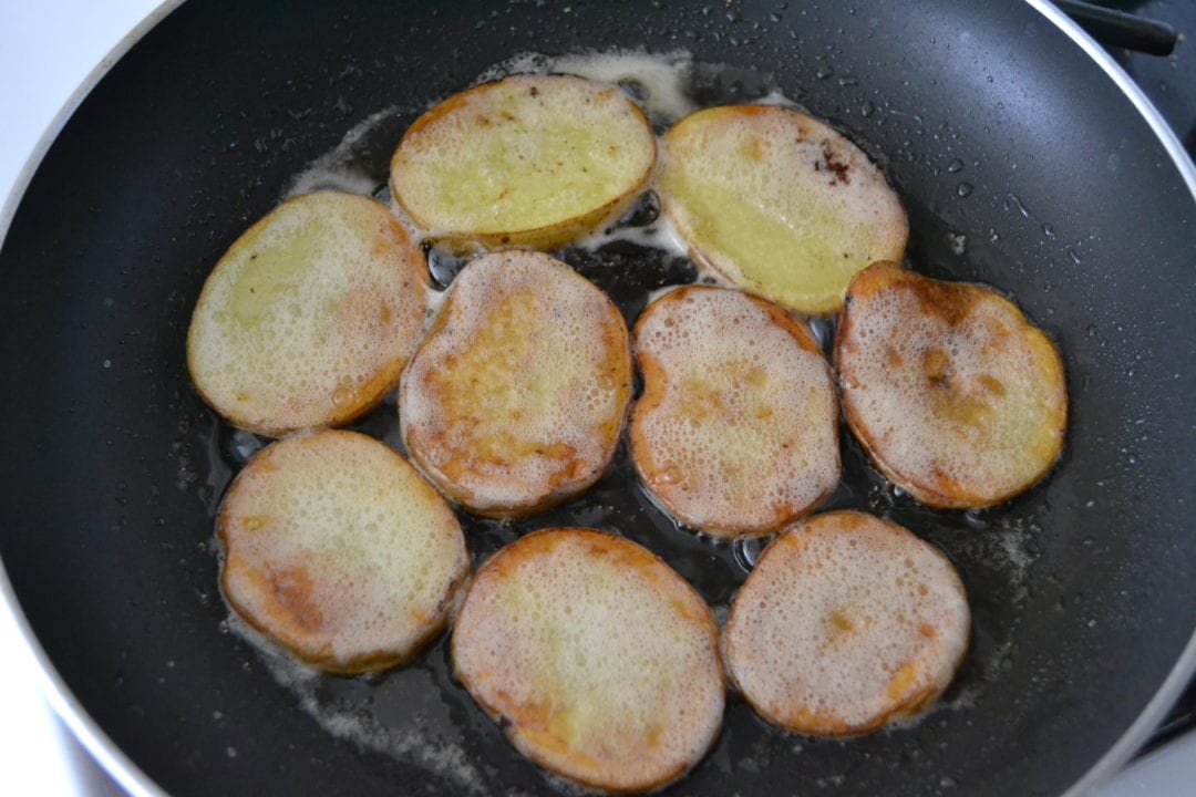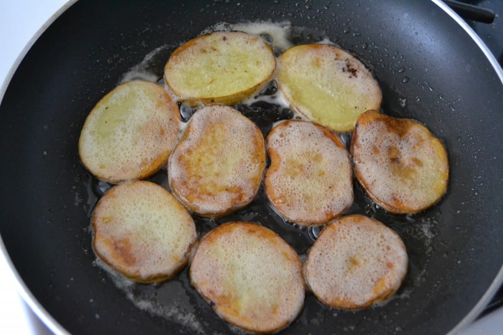 Melt the butter in a large oven-safe skillet over medium heat. Add the sliced potato. Cook the potato for four minutes until golden brown.