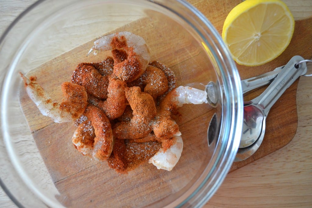 In a small bowl, combine the shrimp with the lemon juice, paprika, cayenne, salt, and pepper. Toss to evenly coat the shrimp in all the seasonings.