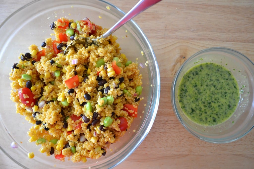 When the quinoa is cooked, fluff with a fork, and remove from heat. Place the quinoa in a medium bowl along with the diced red pepper, corn, black beans, edamame, tomatoes, and red onion. Toss the salad together. Chill in the refrigerator for at least thirty minutes. (If you so desire, this salad can also be served warm.)