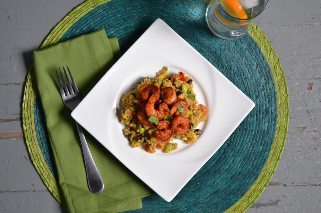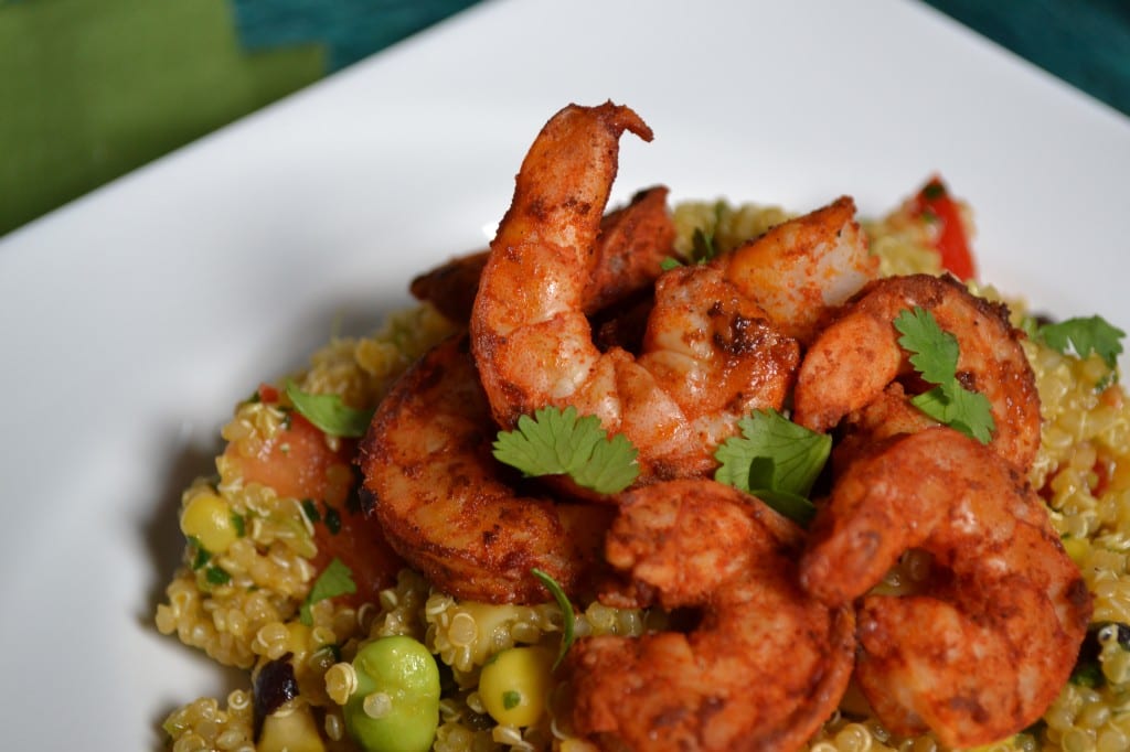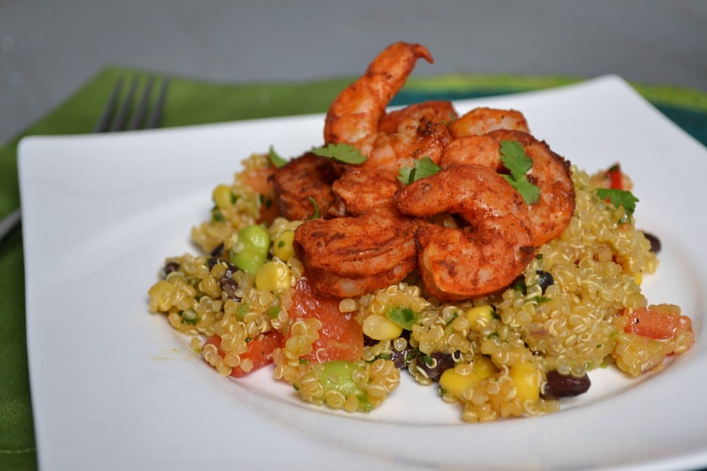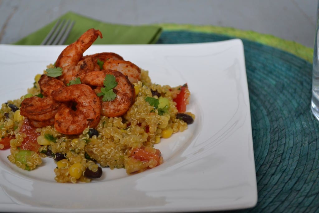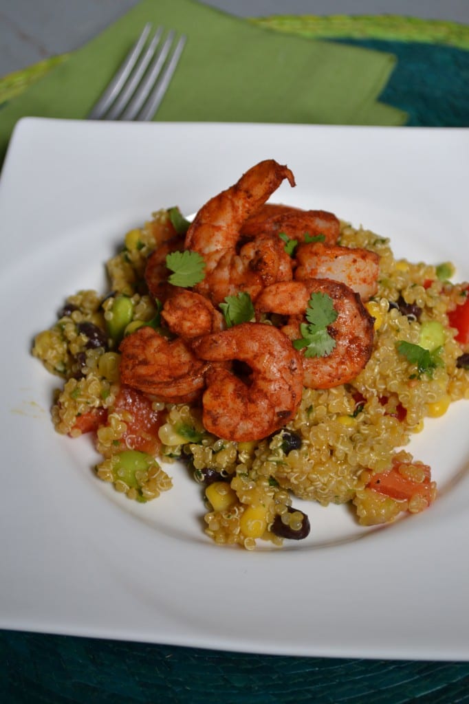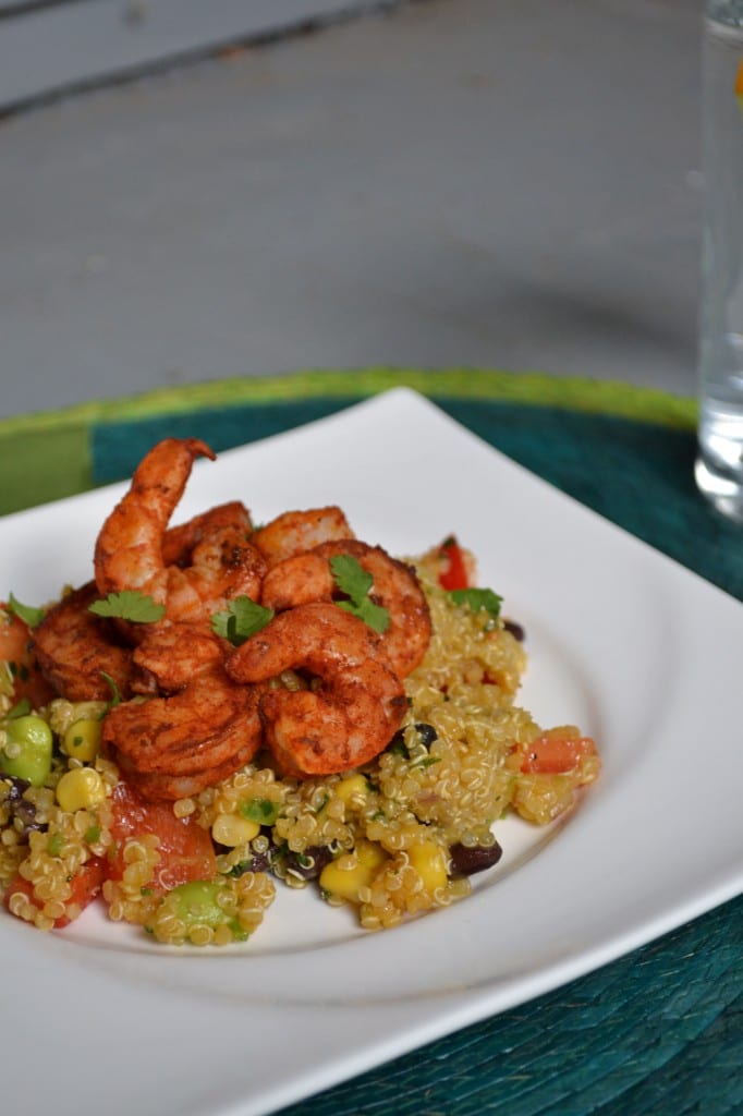 This salad can be done however you like. As long as you have the seasonings for the shrimp, the ingredients for the dressing, and quinoa on hand you can add and subtract vegetables as you see fit.