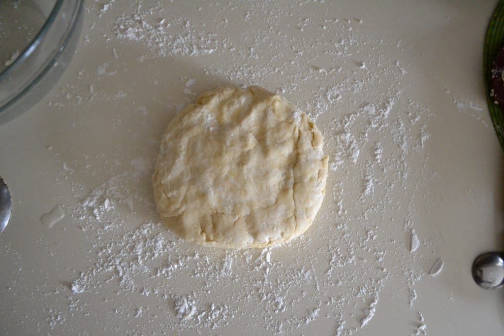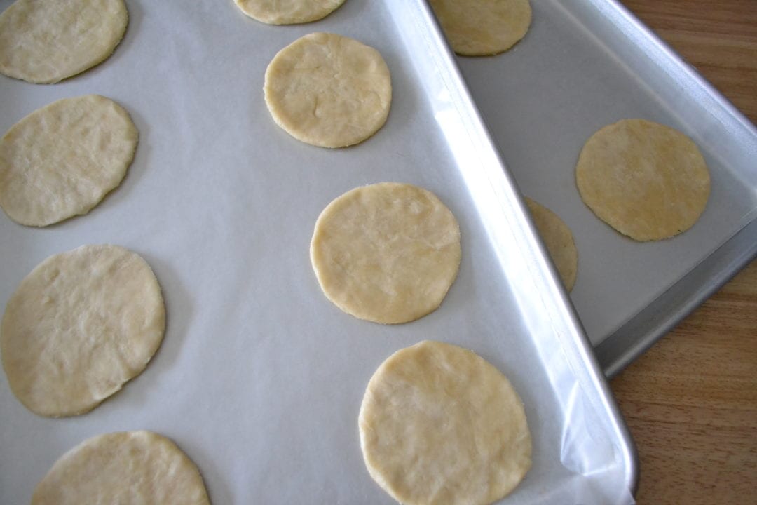 Roll out the dough to about a 1/8 inch thickness. Cut the dough into four inch circles. Lightly flour both sides of the circle. Place the little circles of dough on a baking sheet lined with parchment paper.