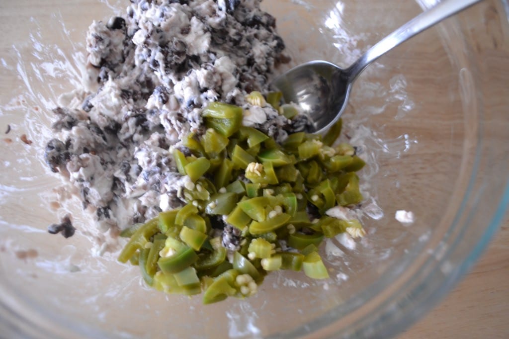 Let the jalapenos cool for a minute or two. Drain the jalapenos, give them a rough chop, and then add them along with the salt, pepper, and cilantro to the bowl with the black beans and goat cheese. Mix the chopped jalapenos into the black beans and goat cheese.
