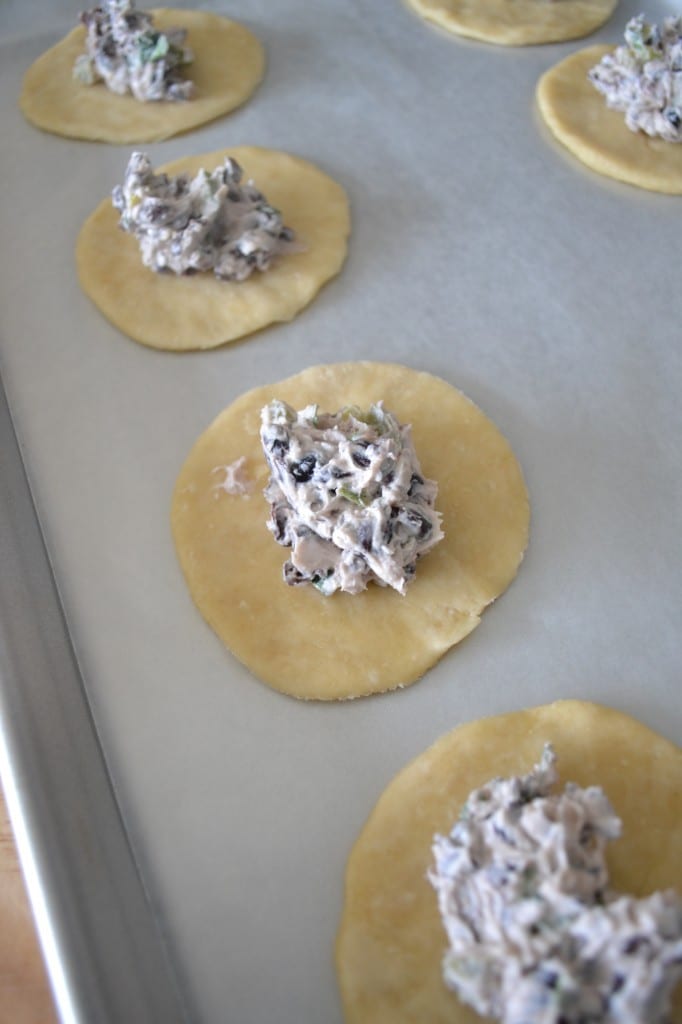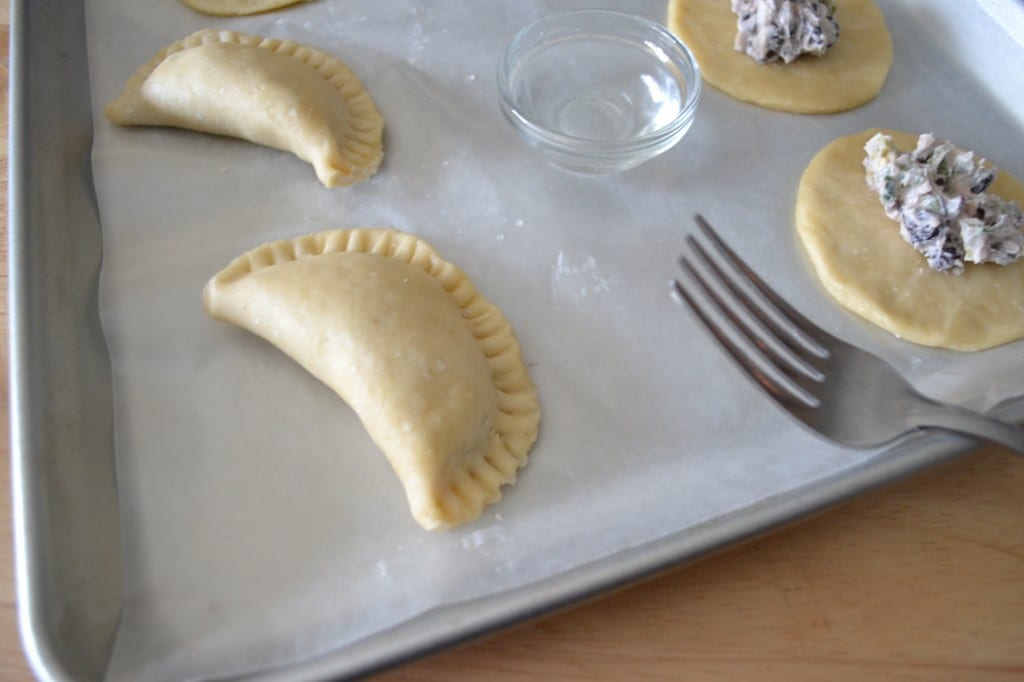 Place about a tablespoon of the mixture in the center of the dough. Dab a little bit of water along the edge of the empanada circle. Fold one side over the other and press the edge sealed with a fork. Continue this process for all empanadas.