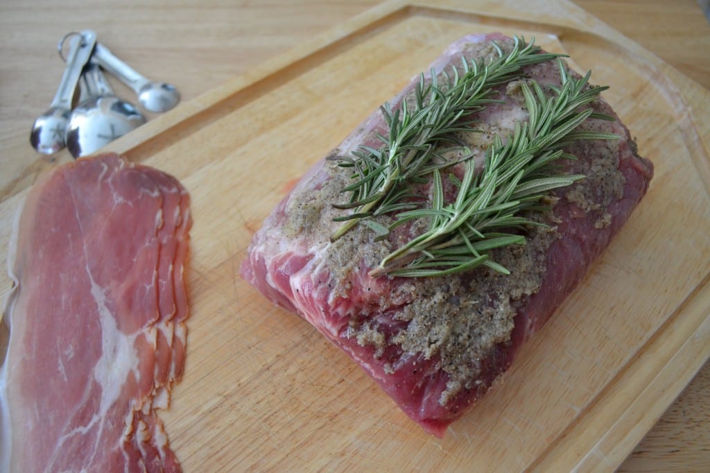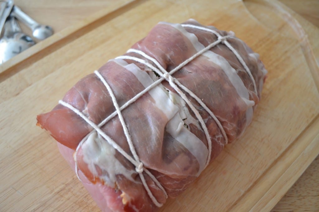 Lay the two sprigs of rosemary length-wise on top of the loin. Cover the sprigs with the prosciutto. Using kitchen string, securely tie the prosciutto in place.