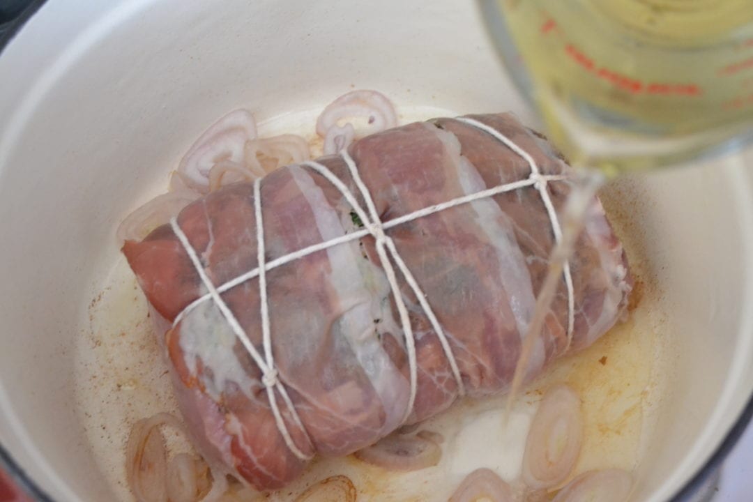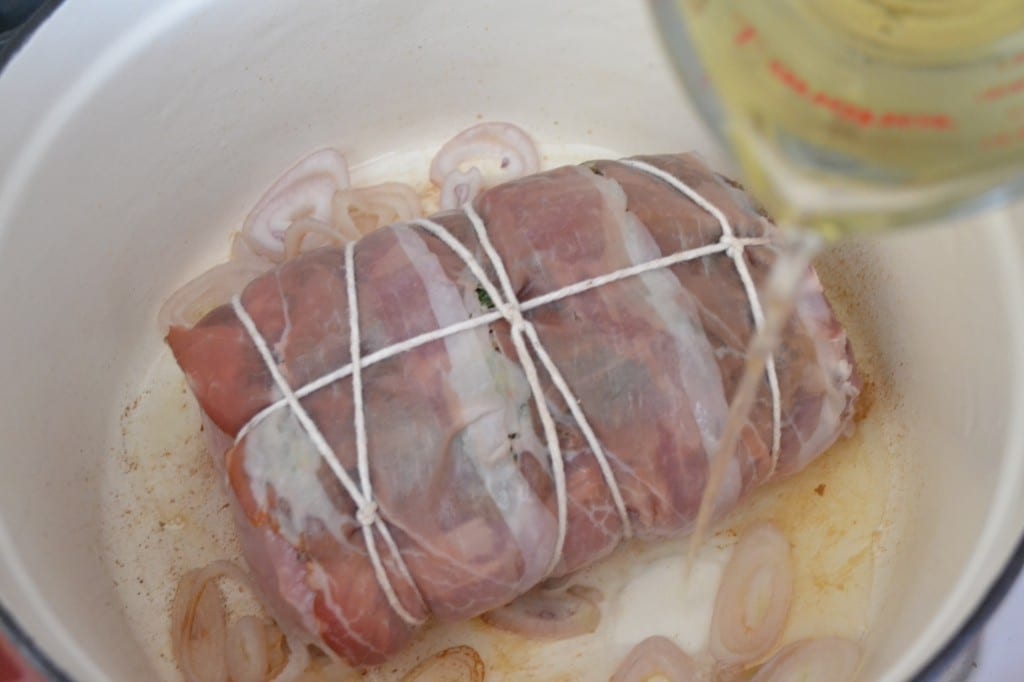 Add the shallots to the Dutch oven. Cook them for a minute or two. Pour in the white wine and chicken stock. Use a rubber spatula and deglaze the pan.