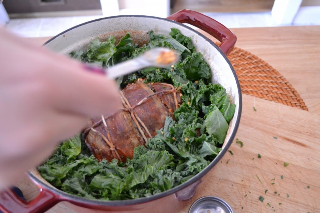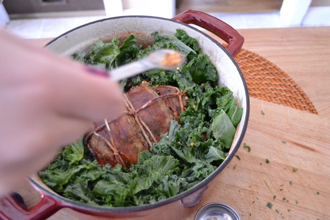 After two and a half hours, remove the Dutch oven. Add the kale and red pepper flakes to the pot and return it to the oven with the lid on for another half an hour.